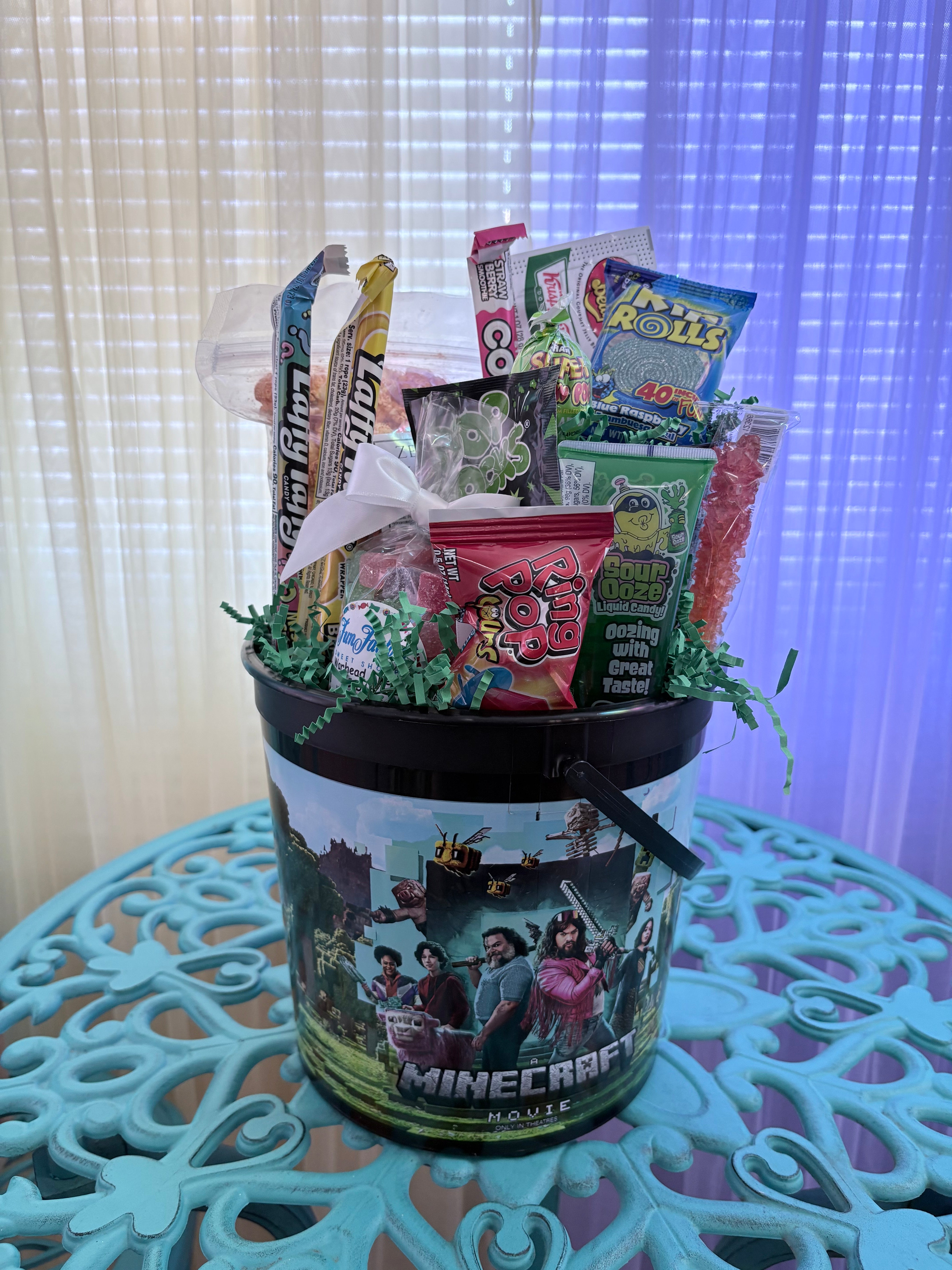 Share the world of Minecraft with this themed Gift Basket featuring a Souvenir Popcorn Bucket & Drink Cup filled with a variety of sparkly, colorful, delicious things. It's perfect for Holiday Gift Exchanges, College Student Care Packages, or any other occasion to send sweet treats to the ultimate Minecraftian!